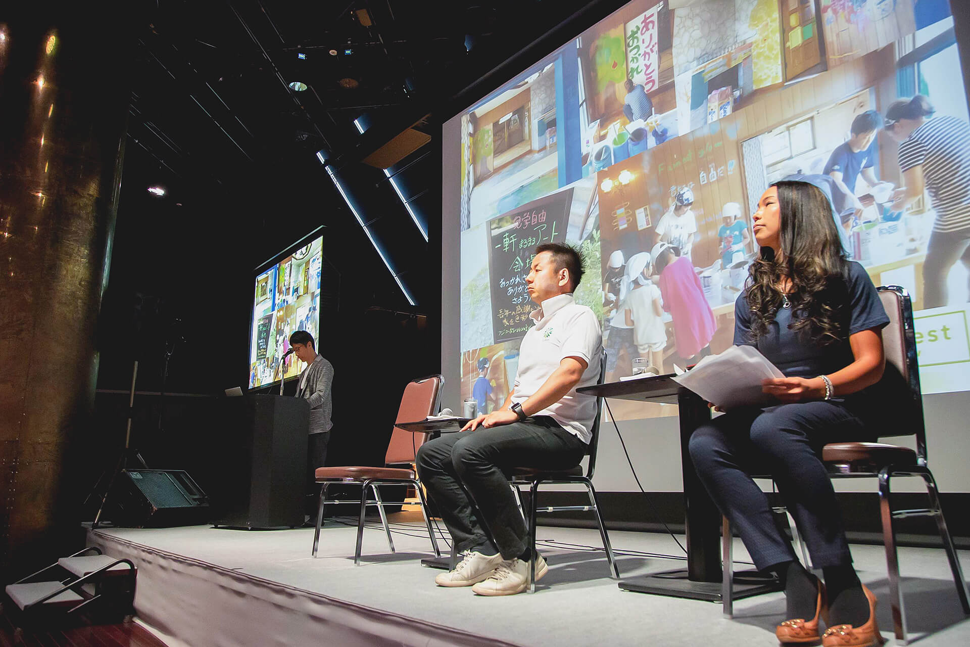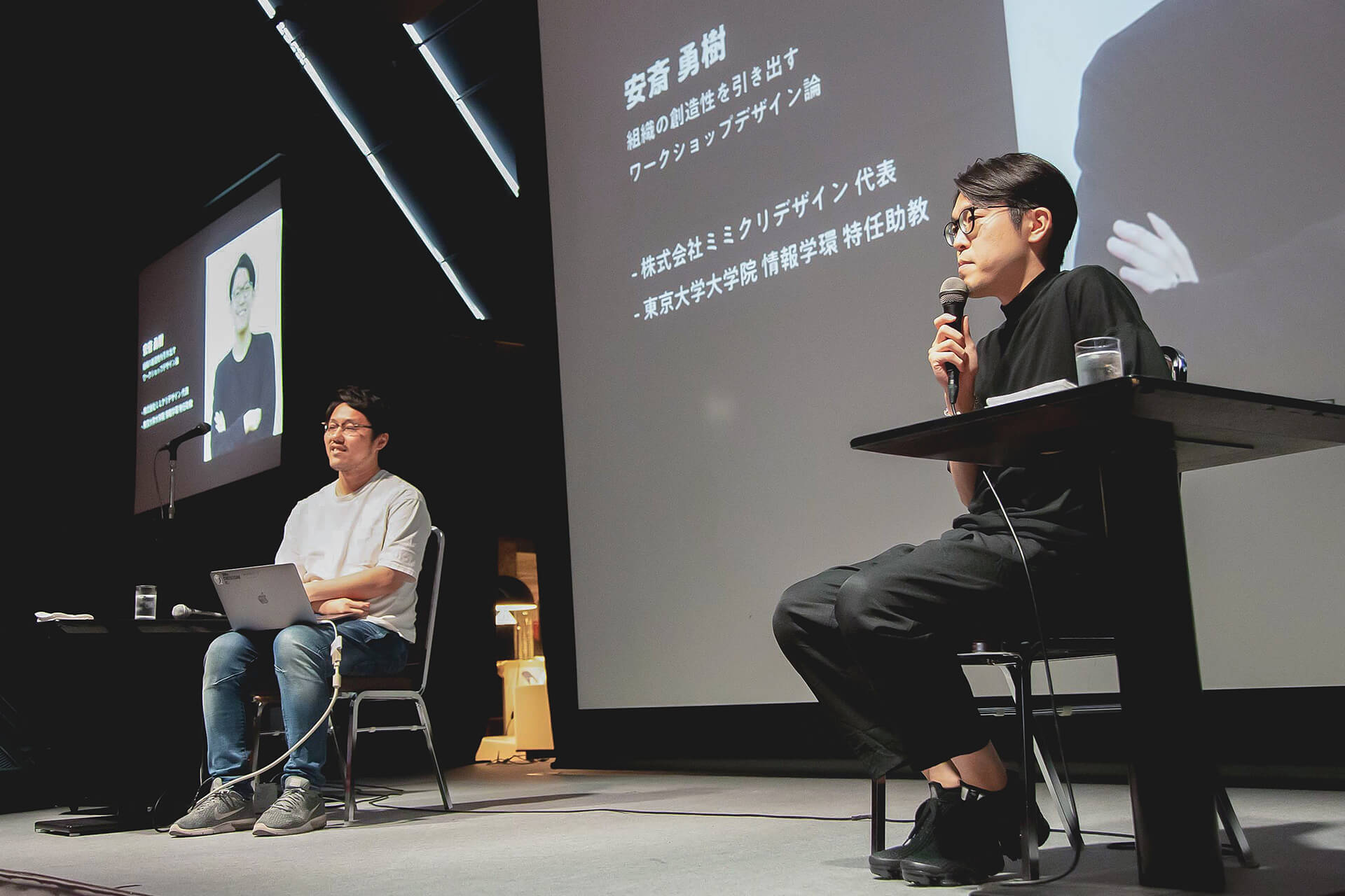 第一部は、開催記念トークセッションとして、ワークショップという手法を用いて解決へと導くファシリテーション集団ミミクリデザインの安斎代表と、弊社ミナベが登壇。大企業が抱えるビジネス課題から地域が抱えるコミュニティ課題まであらゆる課題に対して、「組織変革」におけるブランディングの重要性について語られました。