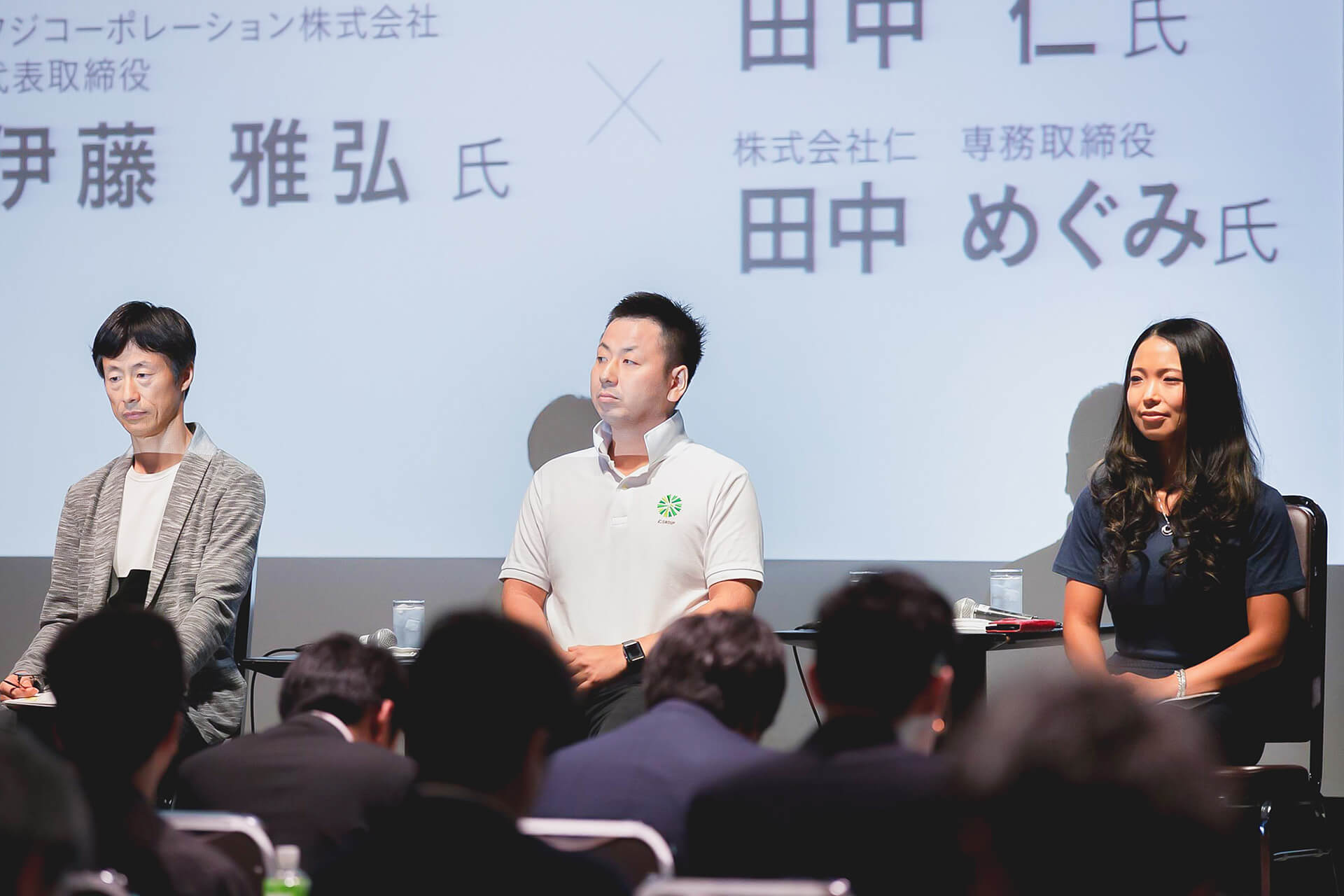 第二部は、経営者の立場から「ブランディング」を経営に活かし組織を強くした、フジコーポレーション株式会社 伊藤 雅弘 代表、株式会社仁 田中 仁代表、田中 めぐみ専務の3名による実践者トーク。