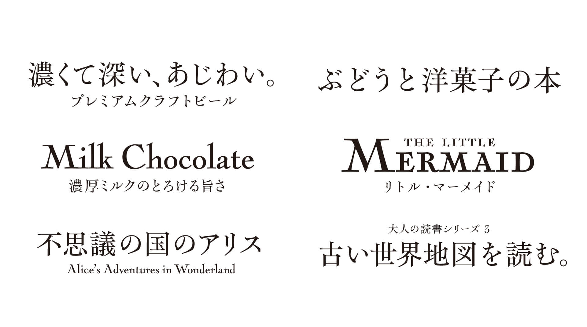 今市フォントは不思議なもので、似た書体を一文字ずつ並べた比較では違いがわかりづらいこともあるのですが、意味を成す言葉として組まれると、途端にそれぞれの声色で喋り出すんです。その個性を、僕たちは「ボイスアイデンティティ」として捉えています。