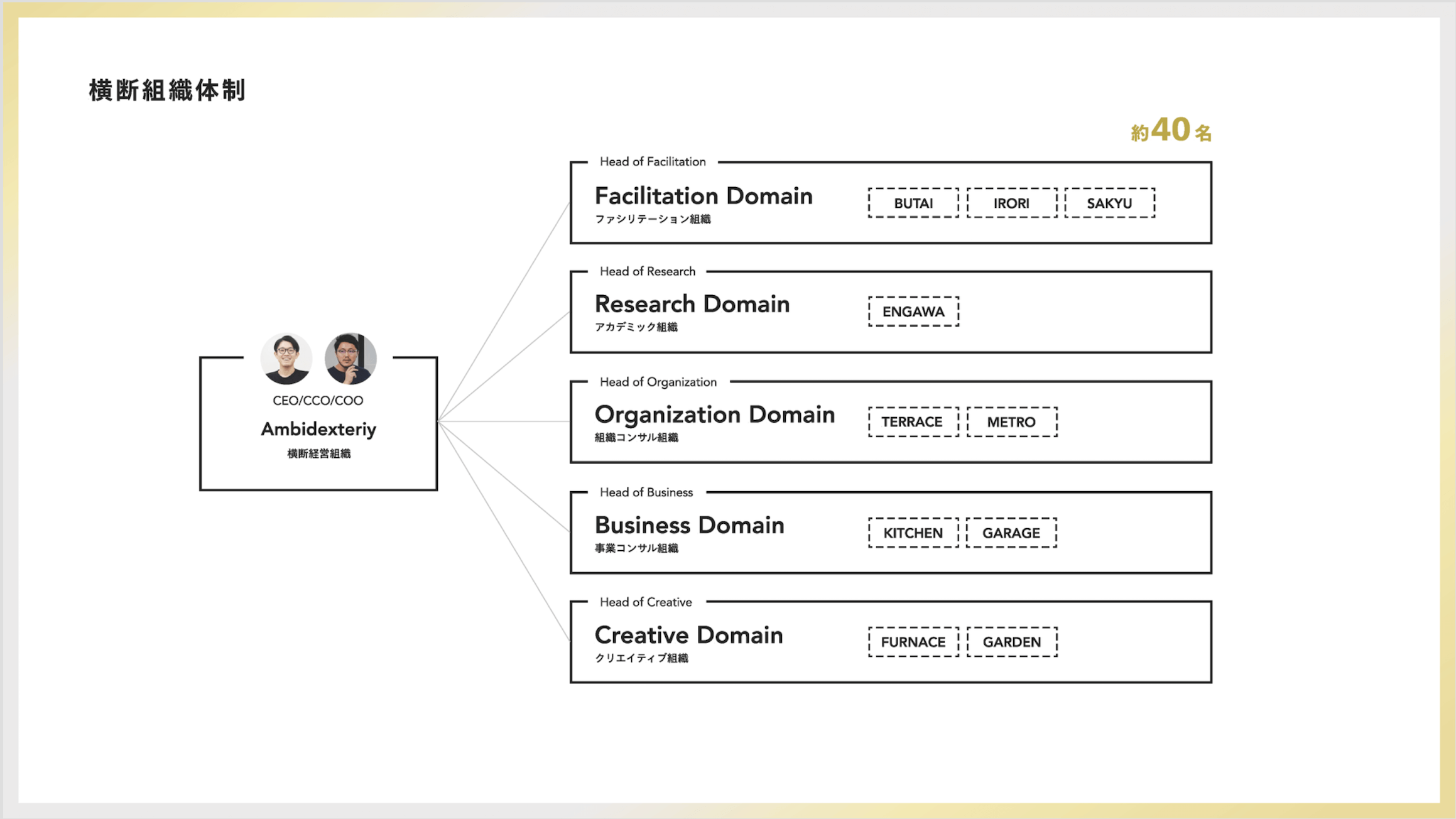 コンサルティングやファシリテートに強みを持つ「プロデュース」「ビジネスデザイン」、クリエイティブに強みをもつ「ブランドストラテジー」「クラフトマン」、各コミュニティを横断して組織づくりを行う「コミュニティ戦略」、という5つのコミュニティ編成になっていたんですね。