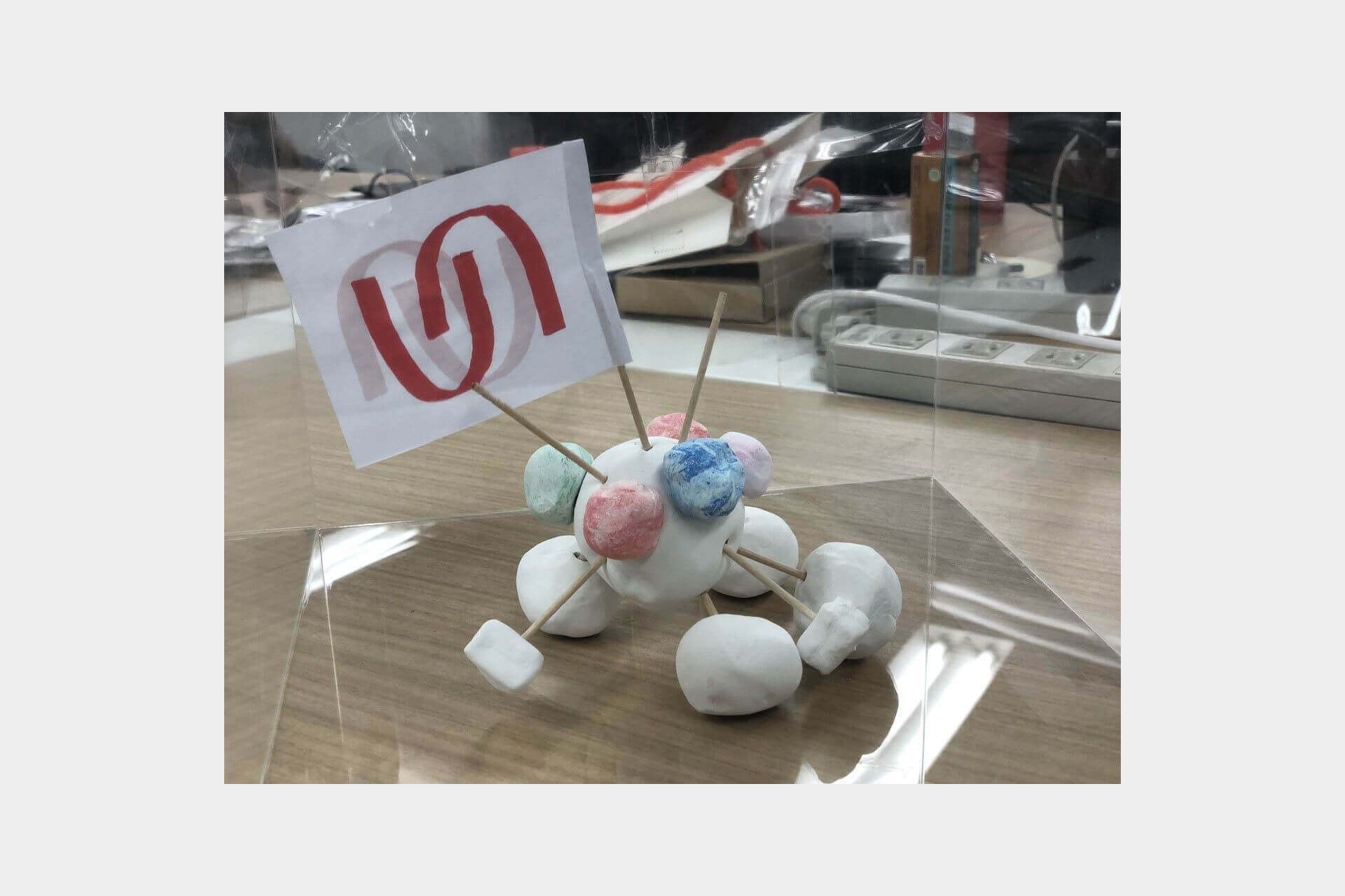 チームに分かれて紙粘土で船を作ってもらったときに、その船に立てられた旗に、初めて見るマークが書かれていて。社名の頭文字の「U」と「T」、です、って説明を聞いて、すごく良いねってなったんです。後付けですけど、顧客と手を握っているようにも見えるんですよね。
